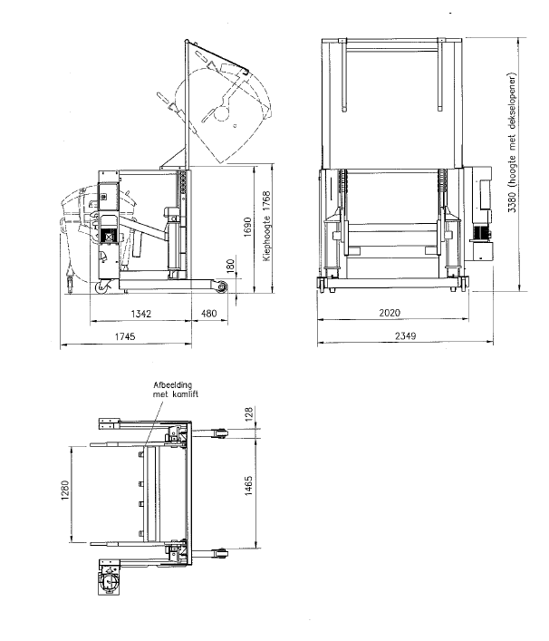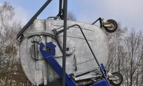 Hoe werkt het? U rijdt een volle 240L, 660L of 1100L container in de kantelaar. Met twee handen bedient u de knoppen: de machine klemt de container vast, tilt hem omhoog en kantelt hem boven de grote container. De deksel van de kleine bak wordt automatisch geopend en al het recyclebaar materiaal valt netjes in de onderliggende container. Daarna zakt de kantelaar terug en kunt u de lege rolcontainer weer weghalen. Het hele proces duurt slechts een halve minuut en vereist geen lichamelijke inspanning van de medewerker. De EXT HKV verhoogt de veiligheid en efficiëntie aanzienlijk. Niemand hoeft nog handmatig te klimmen of te tillen bij het legen van de containers. Het systeem kan diverse typen rolcontainers aan (verstelbaar voor verschillende hoogte-aansluitingen) en heeft een hefvermogen van ca. 700 kg. Verder is de constructie stabiel en robuust. De kantelaar is voorzien van alle veiligheidsmaatregelen zoals een beschermrooster, noodstopknop en tweehandenbediening om ongewenste bewegingen te voorkomen.