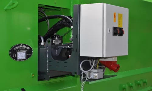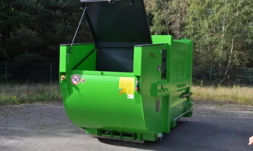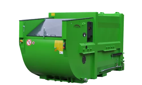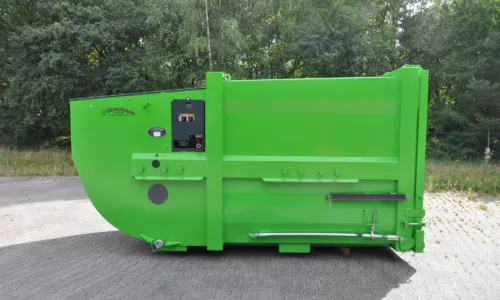 De vulopening is ruim genoeg (ongeveer 1400 x 1000 mm) om standaard afvalzakken, kratjes en andere reststromen gemakkelijk in te werpen. Uniek aan de MPB-414 is dat hij is gebouwd als portaalcontainer (afzetcontainer voor portaalwagens). Dit betekent dat hij opgehaald en verwisseld kan worden door voertuigen met een portaalsysteem (twee armen/kettingen), die vaak kleinere bakken hanteren. Daardoor is de MPB-414 geschikt voor plaatsen waar een grote haak arm wagen niet kan komen. Bergmann heeft bij dit ontwerp rekening gehouden met de ruwe behandeling door portaalkranen: de constructie is extra versterkt en voorzien van handige geleide punten voor het veilig op- en afzetten. Net als de grotere modellen is ook hier de persinrichting pendelend en zelfreinigend, wat zorgt voor een hygiënische werking zonder gedoe. De MPB-414 is eenvoudig te bedienen en vergt weinig onderhoud. Kortom, deze compacte krachtpatser brengt de voordelen van grootschalige afvalverdichting binnen handbereik van kleinere locaties. Zo kunt u ook in krappe omstandigheden efficiënt, schoon en kostenbesparend uw afval managen.