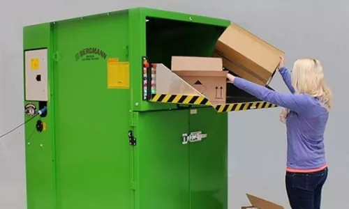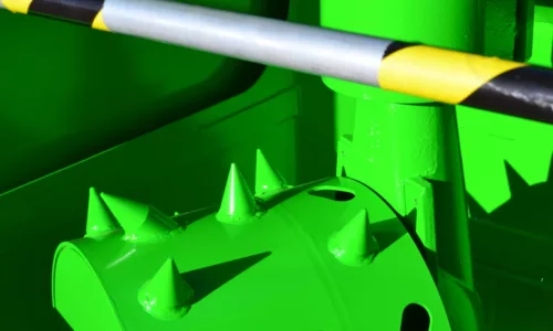 Doordat de machine een roterende perswals gebruikt in plaats van een op- en neergaande persplaat, kan de PS1400-E continu recyclebare stromen verwerken zonder te hoeven pauzeren voor aparte perscycli. U werpt karton, plastic folie, restafval of ander materiaal in de trechter van de machine. Een krachtige stalen rol met mesjes grijpt het materiaal, scheurt het in stukken en drukt het naar beneden in de zak.