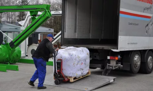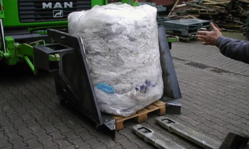 - Verdichting van het afval in een kubusvormige, transparante PE-zak