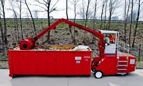 Hiermee kunt u meerdere containers op uw terrein compacteren met maximaal rendement en toch voldoen aan moderne milieueisen. Net als zijn voorgangers rijdt de Mobil-Jumbo M-VII zelfstandig in elke open container (tot ca. 7 m lengte) en verbrijzelt het recyclebaar materiaal door er met een zware wals overheen te rollen. Pallets, grofvuil, groot verpakkingsmateriaal – alles wordt ter plekke verkleind, waardoor er tot 3 keer zoveel recyclebaar materiaal in één container past.